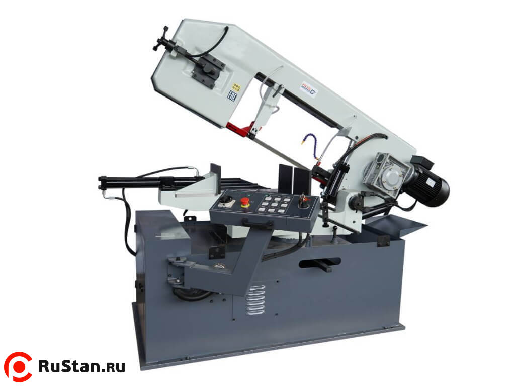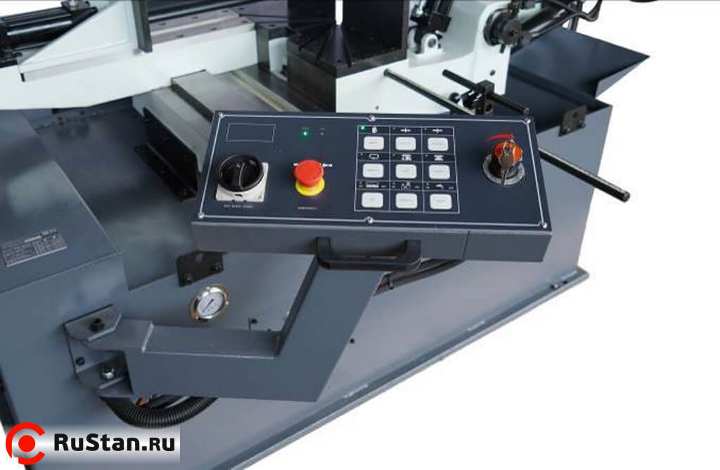 • На верхней панели пульта расположены механические кнопки управления станком. С помощью пульта управления осуществляются: запуск гидравлического насоса, поджим гидравлических тисков, переключение скоростей опускания пильной рамы, запуск вращения ленточного полотна. Также, на пульте оператора расположена кнопка аварийного выключения;