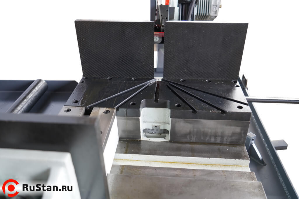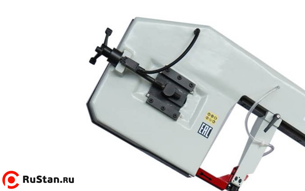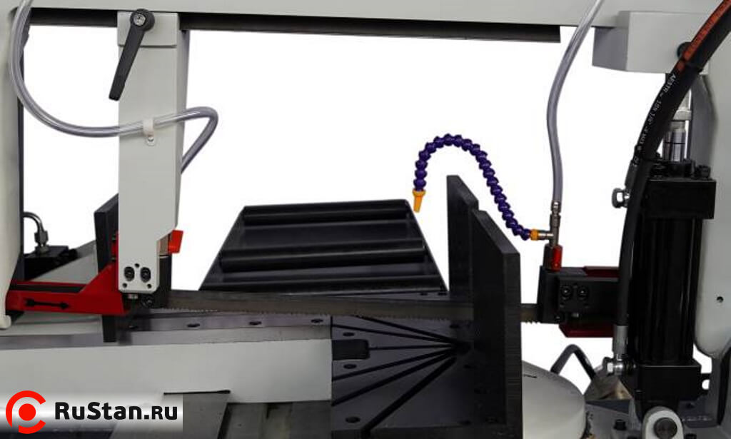 • Станок оснащен тисками с гидравлическим зажимом, а также рольгангом, который помогает распиливать длинные и массивные заготовки;