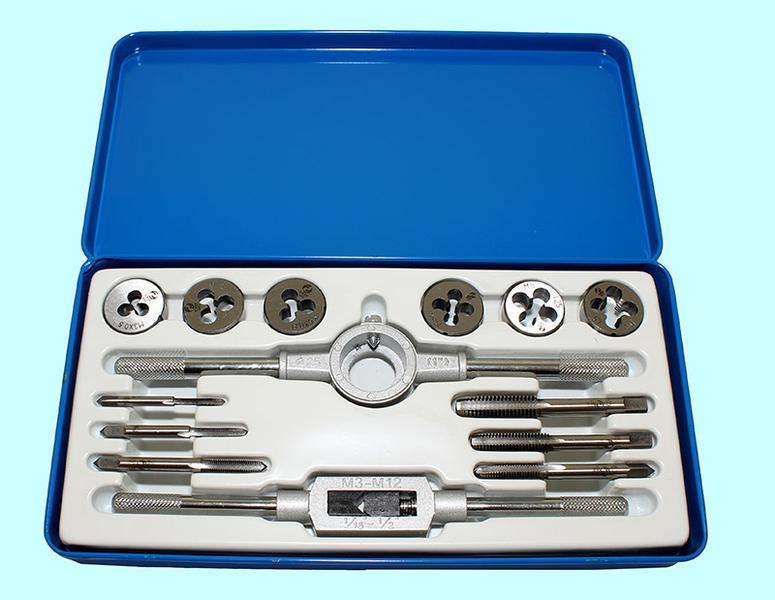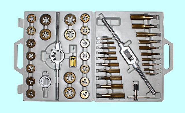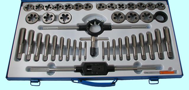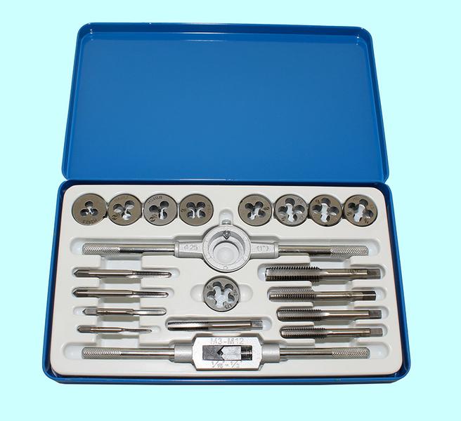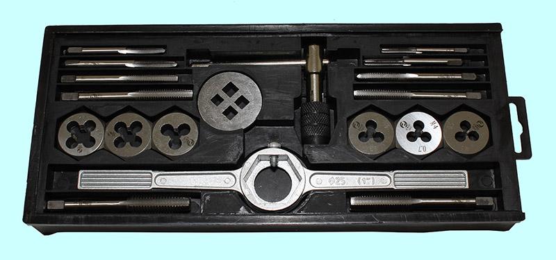 Вороток,плашкодержатель и по 20 метчиков и плашек М6-М24 в мет. коробке (45 позиций)