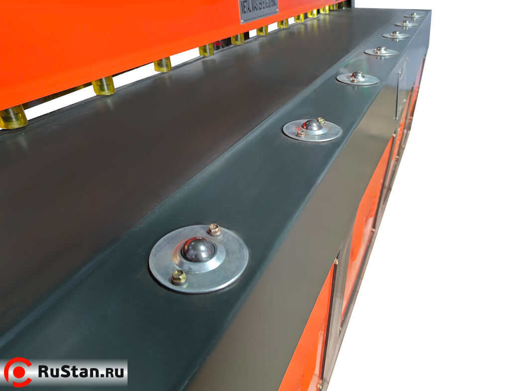 - Рабочий стол гильотины оснащен металлическими роликами, что облегчает позиционирование и перемещение листа по столу, а также подачу в зону резания.
