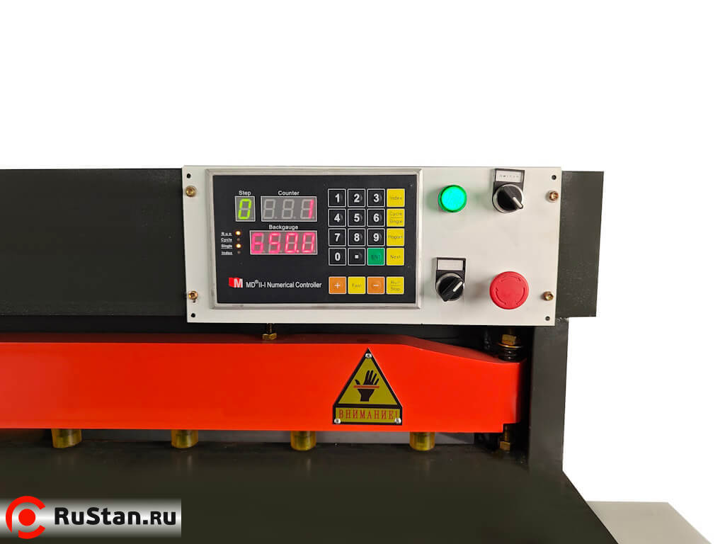 - Управление перемещением заднего упора осуществляется числовым контроллером MD11-1. Данный контроллер обладает интуитивно понятным интерфейсом, также на панели контроллера расположен тумблер включения-выключения, световой индикатор питания и грибок аварийного выключения.