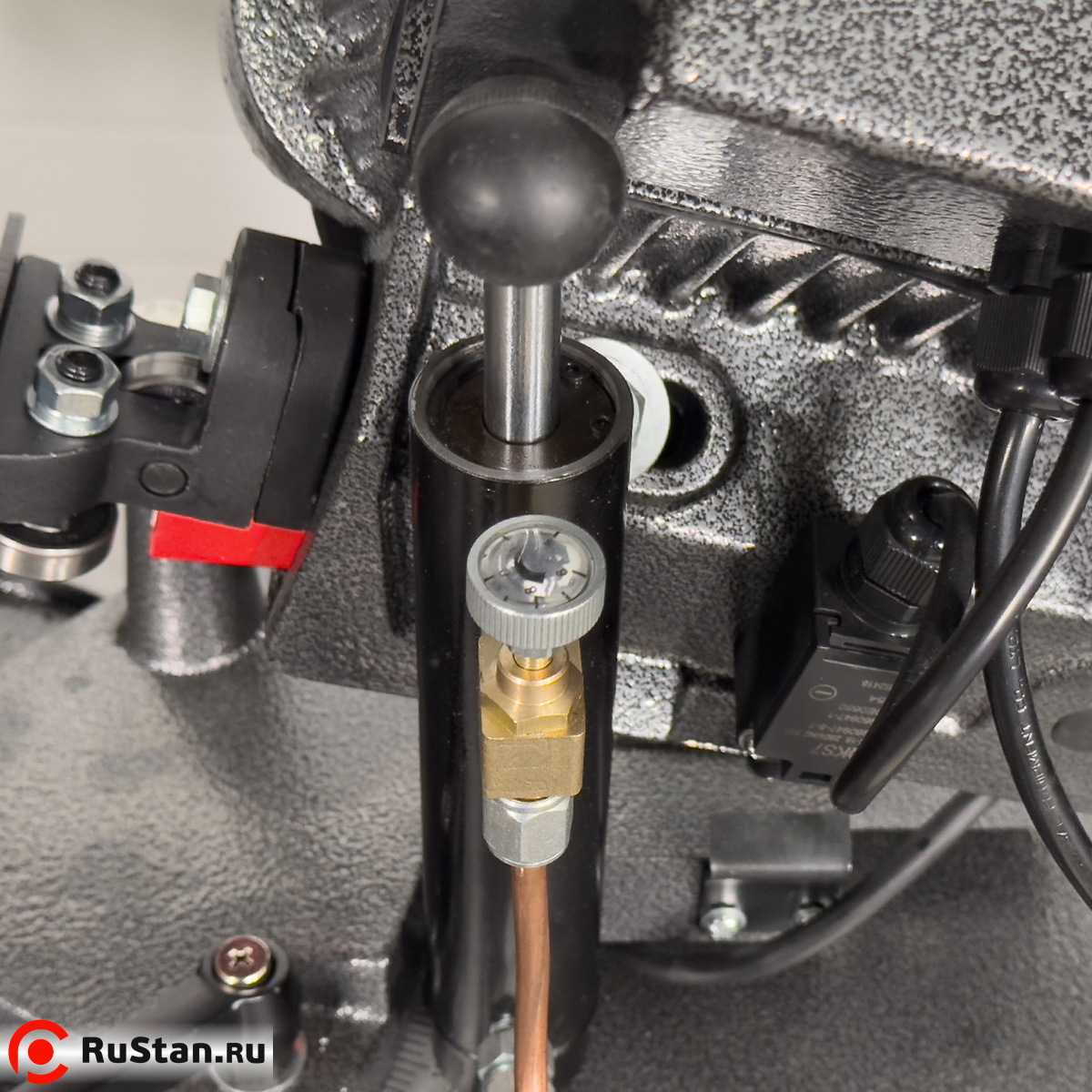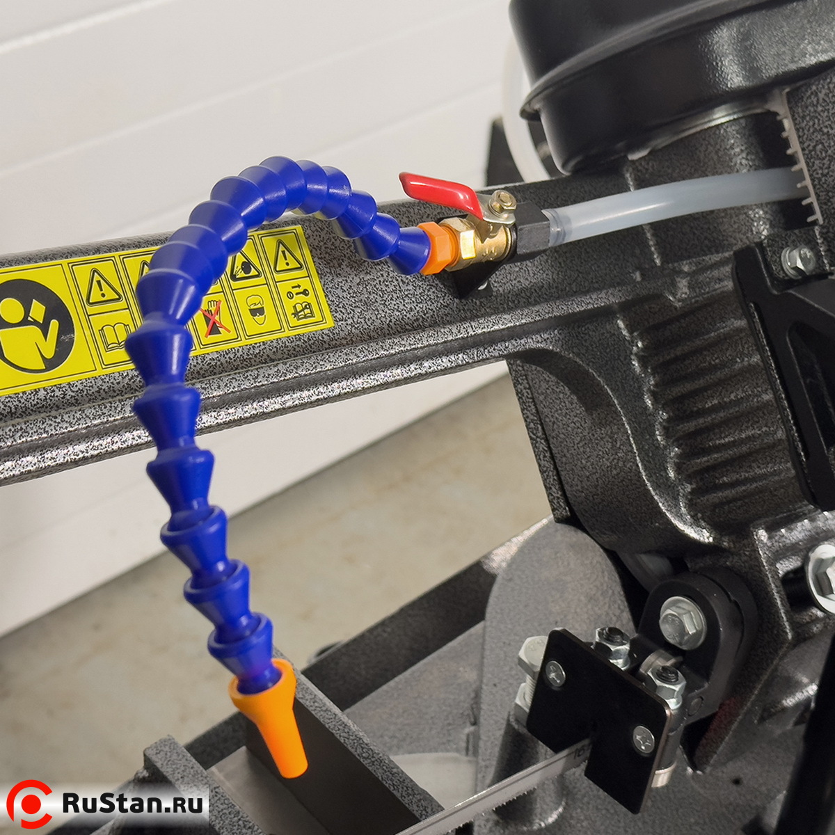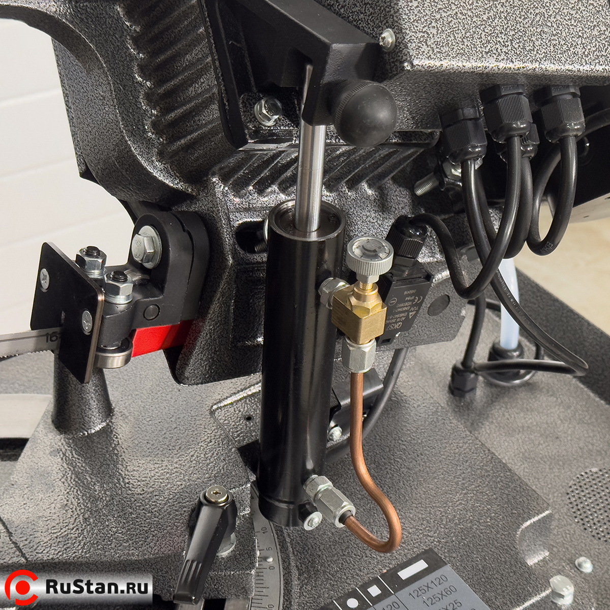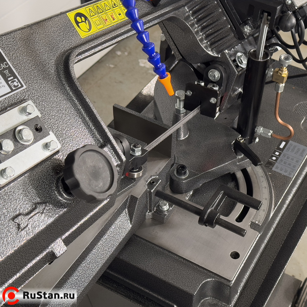 Заготовка фиксируется в регулируемых, быстрозажимных тисках. Скорость опускания пильного узла (скорость подачи) изменяется с помощью регулятора гидроцилиндра.