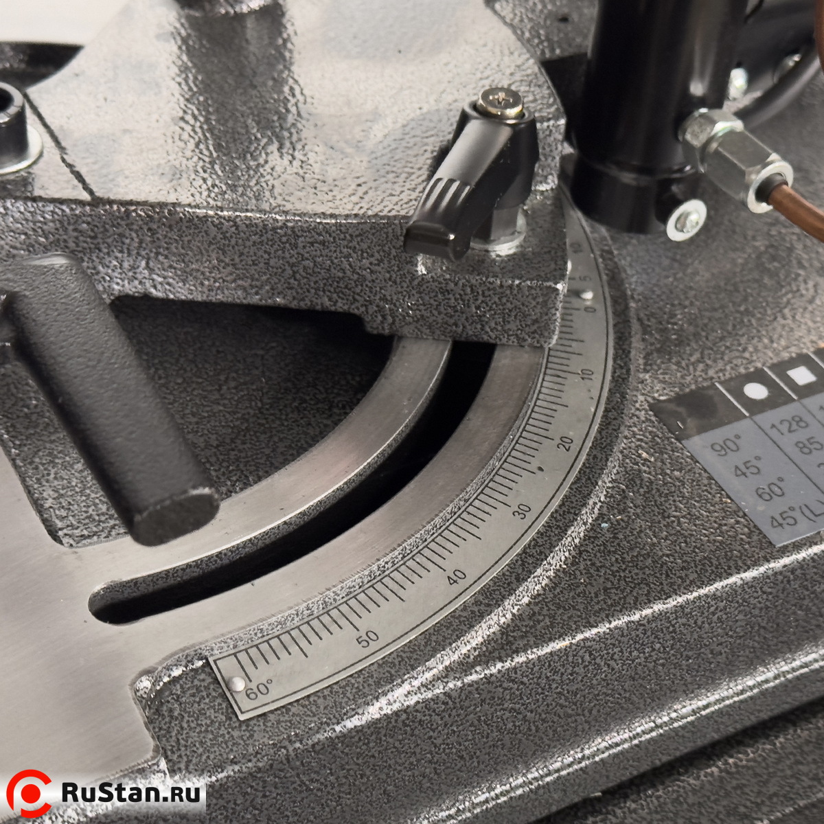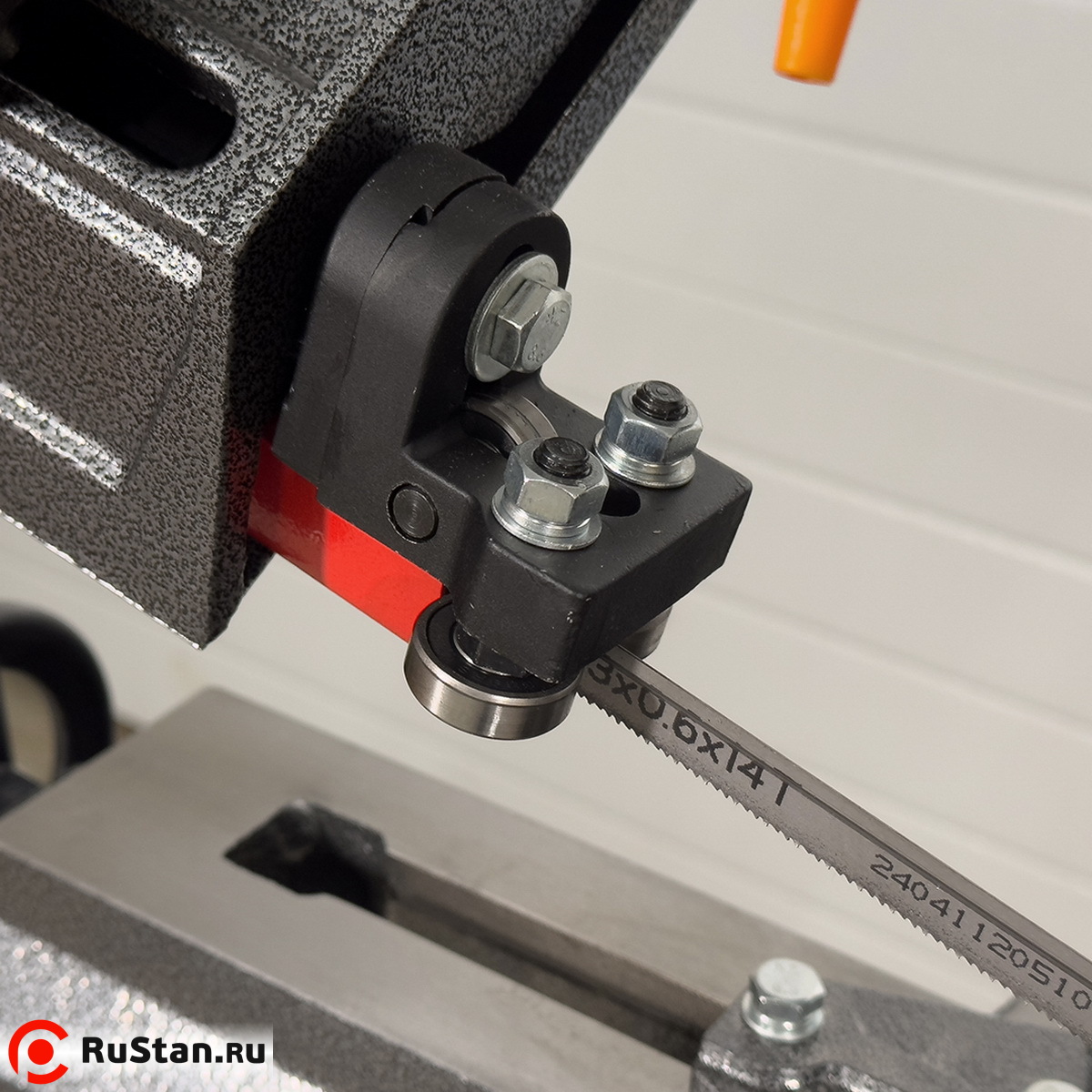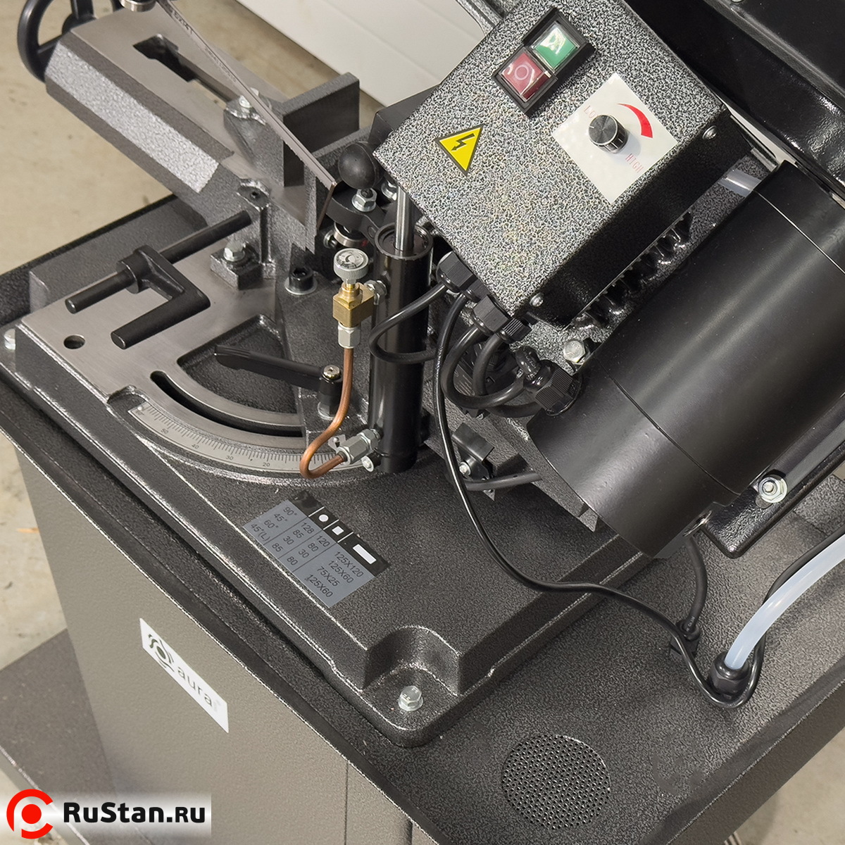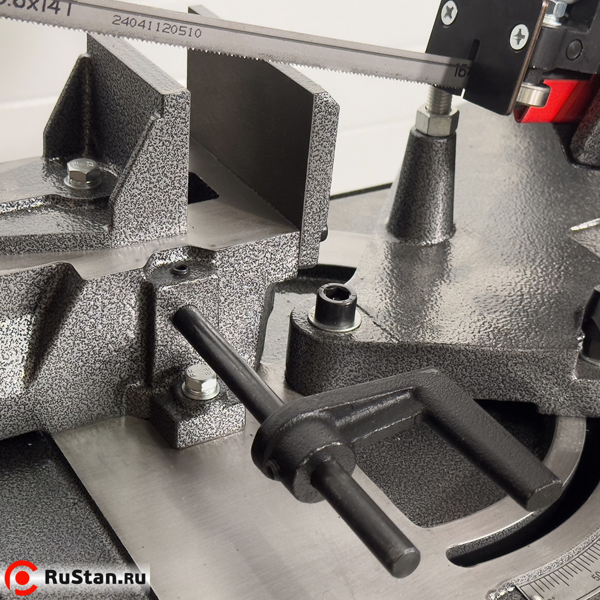 Заготовка фиксируется в регулируемых, быстрозажимных тисках. Скорость опускания пильного узла (скорость подачи) изменяется с помощью регулятора гидроцилиндра.