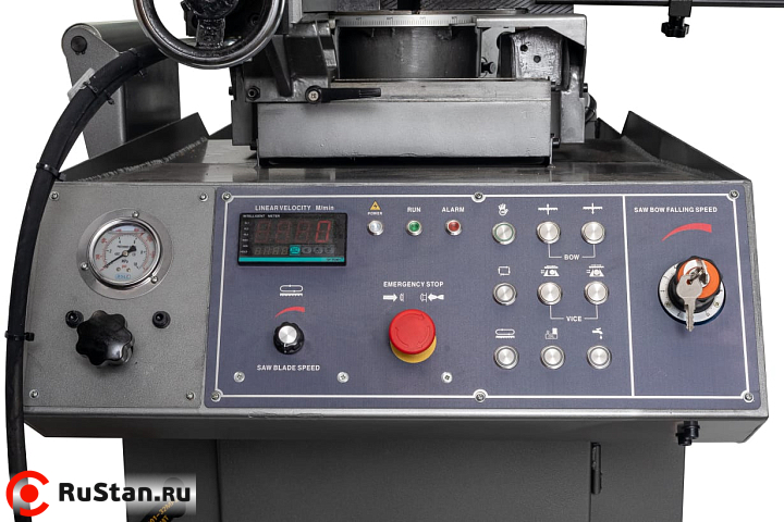 • Пильная рама автоматически поднимается гидравлическим приводом по окончании пиления до верхней поверхности заготовки, и разжимаются губки тисков, остается только передвинуть заготовку и заново запустить полуавтоматический режим пиления