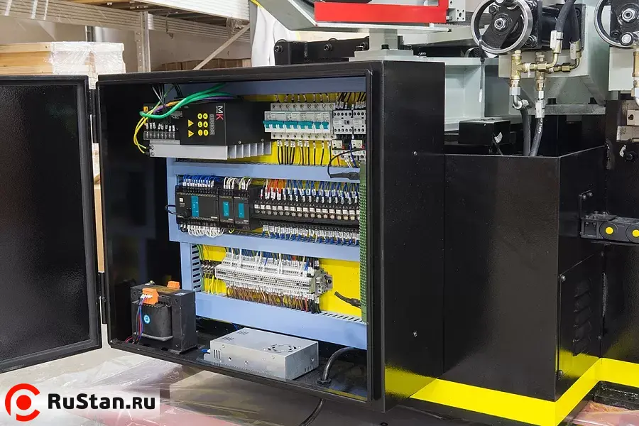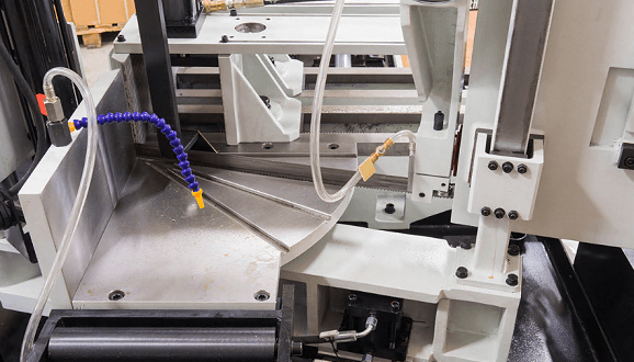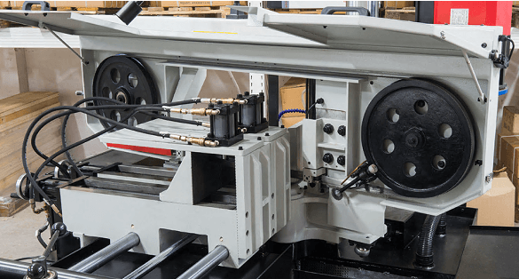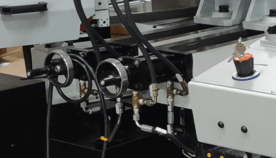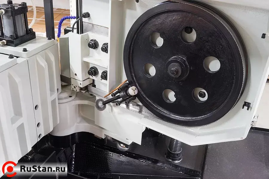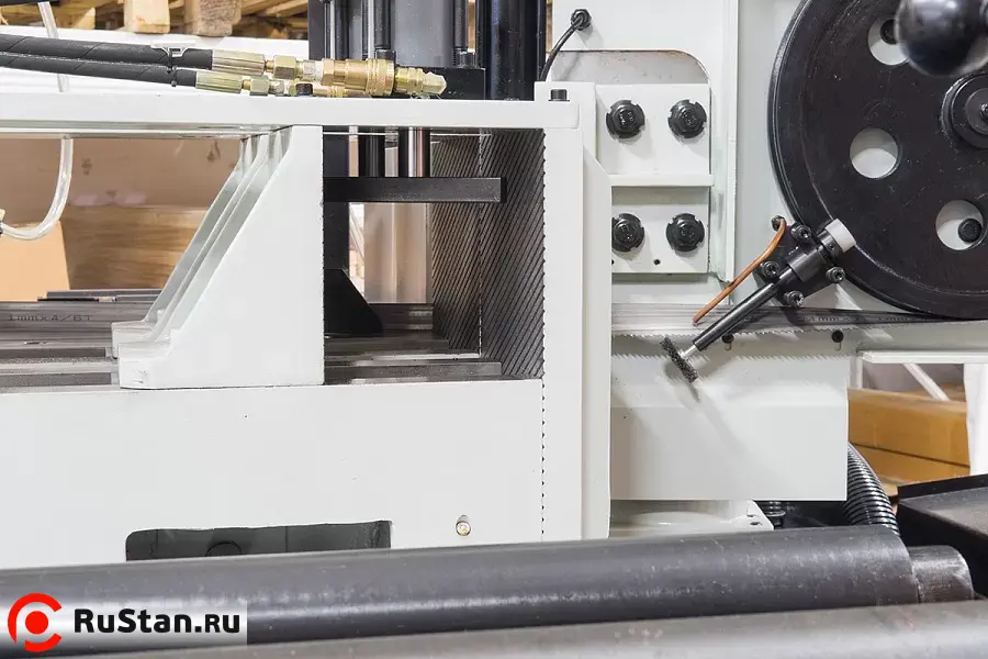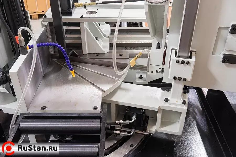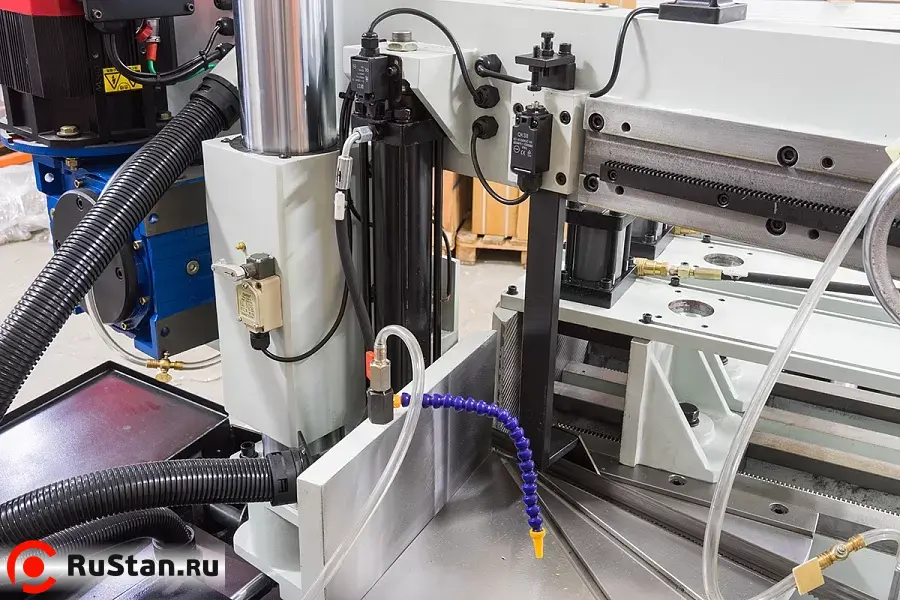 Станок оснащен гидравлическими тисками с возможностью быстрого зажима заготовок. Помимо гидравлического зажатия, тиски имеют механический ход. На основной панели расположены: цветной сенсорный дисплей, с помощью которого можно задать программу и отслеживать процесс пиления, регулятор скорости опускания пилы и кнопка аварийного останова.