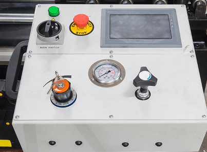 - Предохранительный концевик на кожухе маховика и концевик за маховиком натяжения полотна для контроля/отключения станка при обрыве полотна