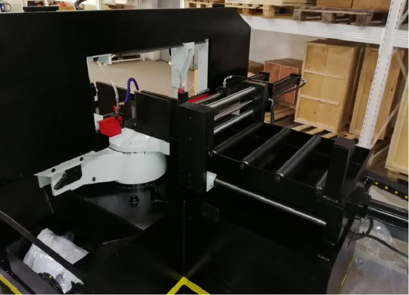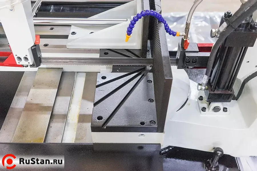 На автоматических станках возможна работа как в ручном режиме (каждая операция выполняется вручную посредством нажатия соответствующей кнопки), так и в автоматическом режиме, когда станок выполняет весь цикл резания: зажим заготовки – подвод заготовки – запуск пилы – опускание рамы – остановка пилы – подъем рамы – отжим тисков. В автоматическом режиме оператору необходимо лишь обеспечить подачу заготовок, предварительно настроить концевой ограничитель на необходимую длину получаемых заготовок и запустить цикл пиления кнопкой «Пуск».