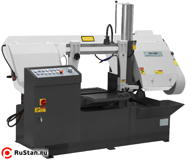 Одностоечные ленточнопильные станки имеют вертикальную стойку (колонну) большого диаметра по которой перемещается горизонтальная пильная рама. Пильная рама, представляет собой стальную сварную конструкцию. На полуавтоматических станках возможна работа как в ручном режиме, когда каждая операция выполняется вручную посредством нажатия соответствующей кнопки, так и в автоматическом режиме, когда станок выполняет весь цикл резания (зажим заготовки – запуск пилы – опускание рамы – остановка пилы – подъем рамы – отжим тисков). В последнем случае оператор должен лишь обеспечить подачу заготовок и нажатие кнопки «Пуск». Станок оснащен гидравлическими тисками с возможностью быстрого зажима заготовок. Для облегчения подачи заготовок станок оборудован роликовым столом с двумя роликами.